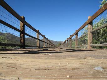 Keywords: walkway bridge footpath boardwalk trail wooden wood railings cross crossing path travel walk walking trees nature outdoors pathway
