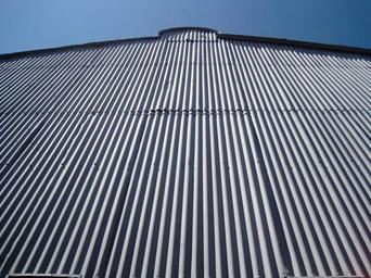 Keywords: wall grey tall corrugated grooved light shadow sunlight lines straight bending optical illusion reduction
