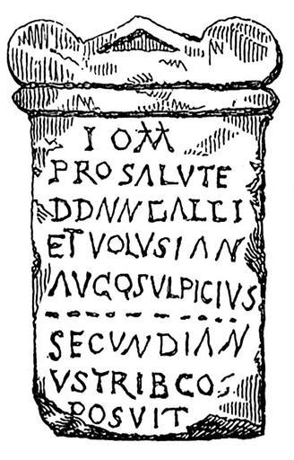| Keywords: woodcut cumbria bowness inscription blackandwhite monochrome black and white Woodcut of a red sandstone altar built into a barn at Bowness House Farm (RIB 2057), Bowness-on-Solway. The inscription reads I(ovi) O(ptimo) M(aximo) / pro salute d(ominorum) n(ostrorum) Galli / et Volusiani / Aug(ustorum) Sulpicius / Secundian / us trib(unus) coh(ortis) / [p]osuit: 'For Jupiter Best and Greatest, for the welfare of our Lords Gallus and Volusianus, emperors, cohort tribune Sulpicius Secundianus set this up.' The joint emperors (father and son) date this to between AD 251 and 253. Scanned from the 1921 8th edition of the Handbook to the Roman Wall. Handbook pp.367–8 Woodcut of a red sandstone altar built into a barn at Bowness House Farm (RIB 2057), Bowness-on-Solway. The inscription reads I(ovi) O(ptimo) M(aximo) / pro salute d(ominorum) n(ostrorum) Galli / et Volusiani / Aug(ustorum) Sulpicius / Secundian / us trib(unus) coh(ortis) / [p]osuit: 'For Jupiter Best and Greatest, for the welfare of our Lords Gallus and Volusianus, emperors, cohort tribune Sulpicius Secundianus set this up.' The joint emperors (father and son) date this to between AD 251 and 253. Scanned from the 1921 8th edition of the Handbook to the Roman Wall. Handbook pp.367–8 |