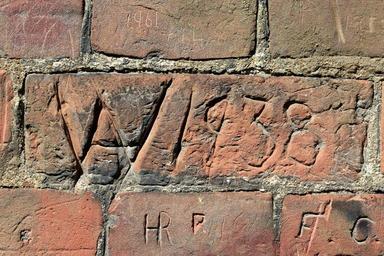 Keywords: wall red brick plaster cement writing carving date vintage history historic initials people wall background brick wall wall art brick texture rough
