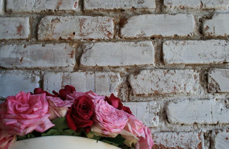 Keywords: wall white brick roses pinks red blooms open bowl decorative contrast