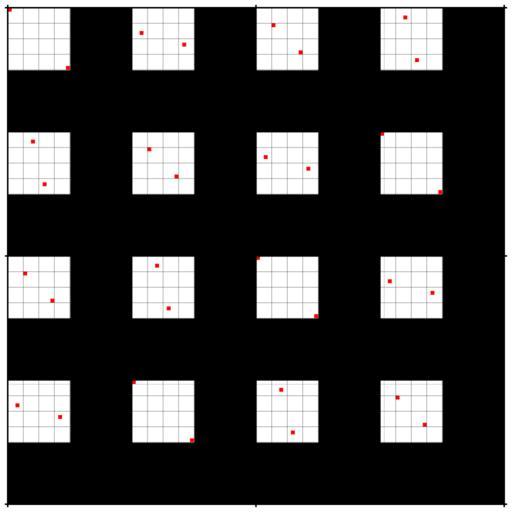 | Keywords: Walsh permutation 1 2 7 8 25 42 127.svg Permutation matrix of the Walsh permutation wp 1 2 7 8 25 42 127 1 2 7 8 25 42 127 is <big> </big> A001317 1 7 -1<big> </big>/2 The elements of this permutation are the even elements of wp 1 3 5 15 17 51 85 255 divided by 2 It is self-inverse so the matrix is symmetric Above that the matrix is also symmetric to the antidiagonal bin2svg own mate2code Permutation matrices of Walsh permutations | ||||