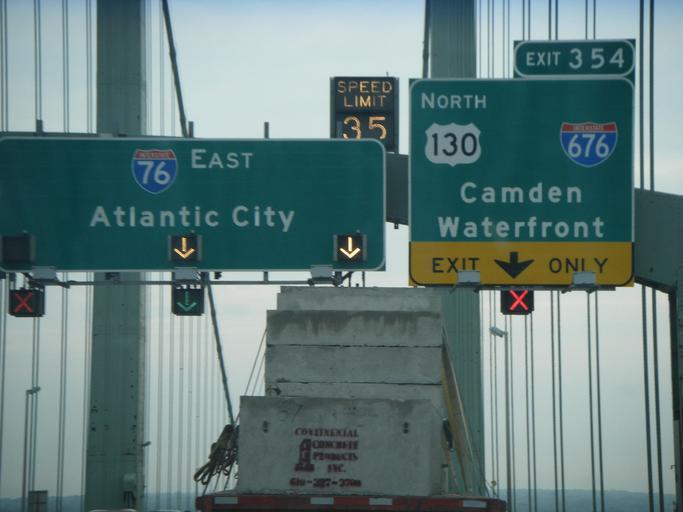 Keywords: Walt Whitman Bridge EB approaching US 130 NB-I-676.JPG Eastbound Walt Whitman Bridge approaching the exit for northbound U S Route 130/Interstate 676 exit 354 in Gloucester City New Jersey Own 2008-07-23 Dough4872 Walt Whitman Bridge