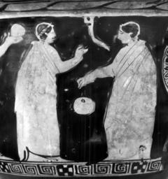 | Keywords: Walters-Dresden Painter - Bell-Krater with Satyrs and Maenads and Three Draped Men - Walters 4875 - Side B Detail.jpg This red-figure bell-krater depicts satyrs and maenads revelling on the front On the left a satyr wearing a fawn skin for a cloak and a wreath stands to the right; in his right hand he holds up a thyrsos from which an ivy vine hangs In front of him a maenad dances right looking around She wears a peplos girded at the waist bracelets earring wreath and possibly a necklace Over her head she holds a thyrsos in her right hand and in her left is a tympanum Next comes a satyr who goes right looking around He also wears a fawn skin for a cloak and a wreath His right arm is extended back over his head and in his left hand he holds a thyrsos On the right another maenad dances right looking around She wears a peplos diadem earring necklace bracelets and wreath and holds a ribbon between her hands Rocks and foliage fill out the scene On the back are three mantled youths two to the right and the third to the left The first holds a circular object possibly a aryballos in his extended right hand The one in the center gestures withhis right hand The third holds an aryballos by a string in his extended right hand A strigil hangs by his head The last two wear fillets Revelling satyrs and maenads is a popular subject at this time and similarly posed dancing figures are common ca 390 380 BC late Classical terracotta with handles cm 33 6 34 7 h x diam ; at mout cm 34 2 diam ; at foot cm 17 1 diam accession number 48 75 30808 Don Marcello Massarenti Collection Rome cat no 195 Henry Walters city Baltimore Walters Art Museum Henry Walters Acquired by Henry Walters with the Massarenti Collection 1902 place of origin Attica Greece Walters Art Museum license Ancient Greek red-figure pottery in the Walters Art Museum Media contributed by the Walters Art Museum needs category review Walters-Dresden Painter Media contributed by the Walters Art Museum needs artist update |