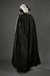| Keywords: Walther von Hallwyls ordensdräkt som Rechtsritter i Johanniterorden bestående av flera delar - Hallwylska museet - 85848.tif JOHANNITERORDENSDRÄKTER <br/><br/>Bestående av delar av ordensdräkt för Ehrenritter samt ordensdräkt för Rechtsritter Delar av ordensdräkt för Ehrenritter Bestående av hatt epåletter med fodral värja med balja samt ett par sporrar <br/><br/>Hatt Av svart silkesfelb på styv stomme Trekantig vitplymascherad Agraff av guldbuljoner bestående av två spirallindade kantiljer lagda med krus den ena av förgylld rund metalltråd massiv den andra av oförgylld platt dylik tråd guldlan samt med en förgylld knapp med ordenskorset i silver Foder av vitt siden merveilleux Mått Vidd 56 cm Brätte längd 10 5 cm Epåletter axelstycken ett par med fodral Av metall i form av en oval skiva med rektangulär platt flik med fasade hörn Skivans sidor med stoppning Epålettens översida överklädd med guldtyg undersidan med röd ylleflanell På flikens översida en förgylld knapp med ordenskorset i vit emalj avnött på undersidan en mycket lång hake av mässing Axelholk av papp insidan överklädd med höggul sammet; på utsidan tätt vertikalt liggande guldbuljoner hårt dubbeltvinnade kantiljer Mått Längd 16 cm ; höjd 8 cm Fodral Av papp med trycklock samt på utsidan klätt med mörkt blågrönt knottrigt papper 8-formigt Locket fodrat med ljust blågrönt moirépapper lockets och fodralets kanter med likafärgat slätt papper Fodralets botten och sidor inuti vadderade samt fodrade med ljusgult fyrskaftat bomullstyg Under botten mörkblått papper Mått Höjd 10 cm ; längd 32 cm ; bredd 19 cm Värja med balja Klinga av stål blankpolerad tveeggad jämnt avsmalnande mot udden med sexsidigt tvärsnitt plana sidor och spetsig udd På klingans övre del i blankt mot mattetsad botten på vardera sidan akantusbladorneringar i tre grupper den övre och den nedre med en trofégrupp dessutom på mellersta gruppen på insidan preussiska örnen jämte ett i S-form gående skriftband varpå MIT GOTT F KÖNIG U VATERLAND Fäste av förgylld mässing Parerplåt hjärtformig skålig med bred ytterkant samt med den spetsiga ändan uppsvängd Mellan klingan och parerplåten två röda yllelappar Handbygel bågformig med ovalt tvärsnitt samt med nedre änden fortsättande på den bygeln motsatta sidan i en kort parerstång med tvär ytterände och avsmalnande inåt Kavel av trä spolformig med ovalt tvärsnitt samt lindad med höger- och vänstertvinnad grövre och finare tråd av silver Knapp långsträckt päronformig med övre ändan avslutad i en platt ändknapp på insvängd hög hals; på knappens utsida fritt pålagt i silver ordenskorset Mått Längd 0 95 m Klinga bredd vid fästet 1 5 cm Fäste längd 13 9 cm Balja Av svartlackerat läder med munbleck och släpsko av förgylld mässing Längs baksidan en grov spannad söm Munbleck och släpsko släta det förstnämnda med snett utvikt mynningskant samt på framsidan en nedåtriktad lång hake avsmalnande nedåt Mått Längd 0 81 m ; bredd 2 2 cm Munbleck längd 9 2 cm Släpsko längd 11 5 cm Sporrar spännsporrar ett par Av förgylld mässing Bygeln klackbågen med något uppsvängda skänklar trefasad utsida och platt insida samt avsmalnande utåt på vardera ändan en kullrig knapp på rakt utstående lång rundstavig hals Remmar saknas Mått Längd 12 5 cm ; bredd 10 9 cm Ordensdräkt för Rechtsritter Bestående av hatt mantel vapenrock livrem med gehäng värja med balja ordensband byxor stövlar sporrar med vristskydd block samt koffert med nycklar och överdrag Hatt Av svart styv filt med på sidorna uppviket brätte kantat med ett svart sidenmoiréband samt uppåt avsmalnande platt hög kulle nedtill denna en tjock snodd av förgylld metalltråd baktill med två öglor samt två tofsar av guldbuljoner tofshuvudet horisontalt lindat med dylika buljoner Framtill en vit och en svart lång strutsplym liggande över kullen och fäst under en kokard av hoprynkat svart sidenmoiréband varpå ordenskorset av vitt linnetyg Foder av vitt siden merveilleux ; svettrem av ljust beigefärgat getskinn baktill med en rosett av silkestrikåband i samma färg Mått Vidd 57 cm Kulle höjd 14 5 cm Brätte bredd 10 5 cm Mantel Av svart siden taft Hand- och maskinsydd Rektangulär i tre raka våder Övre kortsidan med fyra täta rynkrader utom på ett stycke vid vardera framkanten Foder av tunnare svart siden taft isytt med snoddade ytterkanter Halslinning smal dubbelviken Mått Längd 150 cm ; halsvidd 50 cm Vapenrock Av scharlakansrött kläde med knappar av förgylld koppar Livskuren tvåradig med tre par knappar Framstyckenas kanter passpoaler av vitt kläde Axelklaffar flätade av galonband i guld och med ordenskorset samt fodrade med rött kläde Krage rockslag ärmuppslag jämte skörtklaffar av vitt kläde Krage hög dubbelviken rockslag stora tresidiga ärmuppslag höga skörtklaffar konturerade de senare vardera med tre knappar jämte en smal guldgalon de övriga med en bred och en smal dylik Knappar runda kupiga med ordenskorset i relief baksidan av vit metall med en rundstavig ögla På vänstra framstycket en kort horisontal uppslitsning med fällklaff för värjan därovanför fyra horisontala silkesstränsar ordensfästen Foder av vitt siden i detsamma under vardera bakskörtet en ficka Mått Ärmhålsdjup 23 cm ; livlängd 42 cm ; längd hel 76 cm ; ryggbredd halv 18 cm ; ärmlängd 78 cm ; bröstvidd fram 44 cm ; bröstvidd hel 100 cm ; livvidd 90 cm Livrem med spänne och värjgehäng Remmen av grovt läder på utsidan ett pålagt band vävt av fina guldtrådar bildande fem längdgående flacka stavar omväxlande med smala ränder i hålmönster; insidan fodrad med rött kläde; remmens ena ände trubbvinklig på denna en fyrsidig sölja av mässing fastsydd med en kort läderflik samt avsedd för en på livremmens insida befintlig smal rem med mörkröd utsida och nio spännhål samt med innerändan