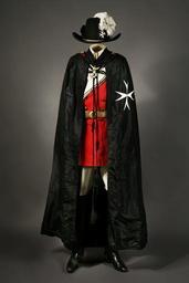 | Keywords: Walther von Hallwyls ordensdräkt som Rechtsritter i Johanniterorden bestående av flera delar - Hallwylska museet - 85849.tif JOHANNITERORDENSDRÄKTER <br/><br/>Bestående av delar av ordensdräkt för Ehrenritter samt ordensdräkt för Rechtsritter Delar av ordensdräkt för Ehrenritter Bestående av hatt epåletter med fodral värja med balja samt ett par sporrar <br/><br/>Hatt Av svart silkesfelb på styv stomme Trekantig vitplymascherad Agraff av guldbuljoner bestående av två spirallindade kantiljer lagda med krus den ena av förgylld rund metalltråd massiv den andra av oförgylld platt dylik tråd guldlan samt med en förgylld knapp med ordenskorset i silver Foder av vitt siden merveilleux Mått Vidd 56 cm Brätte längd 10 5 cm Epåletter axelstycken ett par med fodral Av metall i form av en oval skiva med rektangulär platt flik med fasade hörn Skivans sidor med stoppning Epålettens översida överklädd med guldtyg undersidan med röd ylleflanell På flikens översida en förgylld knapp med ordenskorset i vit emalj avnött på undersidan en mycket lång hake av mässing Axelholk av papp insidan överklädd med höggul sammet; på utsidan tätt vertikalt liggande guldbuljoner hårt dubbeltvinnade kantiljer Mått Längd 16 cm ; höjd 8 cm Fodral Av papp med trycklock samt på utsidan klätt med mörkt blågrönt knottrigt papper 8-formigt Locket fodrat med ljust blågrönt moirépapper lockets och fodralets kanter med likafärgat slätt papper Fodralets botten och sidor inuti vadderade samt fodrade med ljusgult fyrskaftat bomullstyg Under botten mörkblått papper Mått Höjd 10 cm ; längd 32 cm ; bredd 19 cm Värja med balja Klinga av stål blankpolerad tveeggad jämnt avsmalnande mot udden med sexsidigt tvärsnitt plana sidor och spetsig udd På klingans övre del i blankt mot mattetsad botten på vardera sidan akantusbladorneringar i tre grupper den övre och den nedre med en trofégrupp dessutom på mellersta gruppen på insidan preussiska örnen jämte ett i S-form gående skriftband varpå MIT GOTT F KÖNIG U VATERLAND Fäste av förgylld mässing Parerplåt hjärtformig skålig med bred ytterkant samt med den spetsiga ändan uppsvängd Mellan klingan och parerplåten två röda yllelappar Handbygel bågformig med ovalt tvärsnitt samt med nedre änden fortsättande på den bygeln motsatta sidan i en kort parerstång med tvär ytterände och avsmalnande inåt Kavel av trä spolformig med ovalt tvärsnitt samt lindad med höger- och vänstertvinnad grövre och finare tråd av silver Knapp långsträckt päronformig med övre ändan avslutad i en platt ändknapp på insvängd hög hals; på knappens utsida fritt pålagt i silver ordenskorset Mått Längd 0 95 m Klinga bredd vid fästet 1 5 cm Fäste längd 13 9 cm Balja Av svartlackerat läder med munbleck och släpsko av förgylld mässing Längs baksidan en grov spannad söm Munbleck och släpsko släta det förstnämnda med snett utvikt mynningskant samt på framsidan en nedåtriktad lång hake avsmalnande nedåt Mått Längd 0 81 m ; bredd 2 2 cm Munbleck längd 9 2 cm Släpsko längd 11 5 cm Sporrar spännsporrar ett par Av förgylld mässing Bygeln klackbågen med något uppsvängda skänklar trefasad utsida och platt insida samt avsmalnande utåt på vardera ändan en kullrig knapp på rakt utstående lång rundstavig hals Remmar saknas Mått Längd 12 5 cm ; bredd 10 9 cm Ordensdräkt för Rechtsritter Bestående av hatt mantel vapenrock livrem med gehäng värja med balja ordensband byxor stövlar sporrar med vristskydd block samt koffert med nycklar och överdrag Hatt Av svart styv filt med på sidorna uppviket brätte kantat med ett svart sidenmoiréband samt uppåt avsmalnande platt hög kulle nedtill denna en tjock snodd av förgylld metalltråd baktill med två öglor samt två tofsar av guldbuljoner tofshuvudet horisontalt lindat med dylika buljoner Framtill en vit och en svart lång strutsplym liggande över kullen och fäst under en kokard av hoprynkat svart sidenmoiréband varpå ordenskorset av vitt linnetyg Foder av vitt siden merveilleux ; svettrem av ljust beigefärgat getskinn baktill med en rosett av silkestrikåband i samma färg Mått Vidd 57 cm Kulle höjd 14 5 cm Brätte bredd 10 5 cm Mantel Av svart siden taft Hand- och maskinsydd Rektangulär i tre raka våder Övre kortsidan med fyra täta rynkrader utom på ett stycke vid vardera framkanten Foder av tunnare svart siden taft isytt med snoddade ytterkanter Halslinning smal dubbelviken Mått Längd 150 cm ; halsvidd 50 cm Vapenrock Av scharlakansrött kläde med knappar av förgylld koppar Livskuren tvåradig med tre par knappar Framstyckenas kanter passpoaler av vitt kläde Axelklaffar flätade av galonband i guld och med ordenskorset samt fodrade med rött kläde Krage rockslag ärmuppslag jämte skörtklaffar av vitt kläde Krage hög dubbelviken rockslag stora tresidiga ärmuppslag höga skörtklaffar konturerade de senare vardera med tre knappar jämte en smal guldgalon de övriga med en bred och en smal dylik Knappar runda kupiga med ordenskorset i relief baksidan av vit metall med en rundstavig ögla På vänstra framstycket en kort horisontal uppslitsning med fällklaff för värjan därovanför fyra horisontala silkesstränsar ordensfästen Foder av vitt siden i detsamma under vardera bakskörtet en ficka Mått Ärmhålsdjup 23 cm ; livlängd 42 cm ; längd hel 76 cm ; ryggbredd halv 18 cm ; ärmlängd 78 cm ; bröstvidd fram 44 cm ; bröstvidd hel 100 cm ; livvidd 90 cm Livrem med spänne och värjgehäng Remmen av grovt läder på utsidan ett pålagt band vävt av fina guldtrådar bildande fem längdgående flacka stavar omväxlande med smala ränder i hålmönster; insidan fodrad med rött kläde; remmens ena ände trubbvinklig på denna en fyrsidig sölja av mässing fastsydd med en kort läderflik samt avsedd för en på livremmens insida befintlig smal rem med mörkröd utsida och nio spännhål samt med innerändan