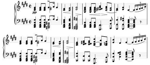 | Keywords: WandererFantasieD760-Adagio-beginning.svg Beginning of the adagio of Franz Schubert's piano fantasia D 760 File generated from the SVG output of Lilypond with the following file <pre> \header title Wanderer Fantasie D 760 subtitle Adagio source IMSLP00886 Leipzig Breitkopf Härtel 1884-1897 Plate F S 108 composer Franz Schubert 1797-1828 copyright Public Domain \version 2 10 \score \new PianoStaff << \set PianoStaff connectArpeggios t \new Staff \clef treble \key e \major \time 2/2 <cis' e' gis'>4\pp <cis' e' gis'>8 <cis' e' gis'>8 << gis'8 -> a'16 gis'4 \\ <dis' fis'>2 >> <cis' e'>4\< <cis' fis'>4\ <dis' gis'>2\arpeggio\> <gis' cis' e' gis>4\ <gis cis' e' gis'>8\< <gis cis' e' gis'>8 <d' eis' gis' b'>4\ \> <cis' fis' a'>8\ <cis' fis'> <cis' e'>4 <dis' gis'> cis' ~ \times 4/5 cis'16 dis' e' fis' a' \break <cis' e' gis'>4 <cis' e' gis'>8 <cis' e' gis'>8 << gis'8 -> a'16 gis'4 \\ <dis' fis'>2 >> <cis' e'>4\< <cis' fis'>4\ <dis' gis'>2\arpeggio\> <a cis' e'>4\ <b cis' eis' gis'>8 <b cis' eis' gis'>8 <a~ cis'~ fis' cis>4 <a cis' a'>8 <a c' fis'> <e' b'>4 dis' e' ~ \times 4/5 e'16 fis' gis' a' cis \new Staff \clef bass \key e \major \time 2/2 <cis e gis cis gis>4 <cis e gis cis gis>8 <cis e gis cis gis>8 << gis8 a16 gis4 \\ <bis dis gis bis >2 >> <cis e gis cis e gis>4 <a cis fis a fis a>4 <gis bis dis gis gis bis>2\arpeggio <cis e gis cis>4 <cis e gis cis>8 <cis e gis cis>8 <fis fis >4 <a a fis>8 <gis gis gis>4 <gis gis fis bis> <cis e gis cis e gis>4 ~ <cis e gis cis e gis>8 r8 \break <cis e gis cis gis>4 <cis e gis cis gis>8 <cis e gis cis gis>8 << gis8 a16 gis4 \\ <bis dis gis bis >2 >> <cis e gis cis e gis>4 <a cis fis a fis a>4 <gis bis dis gis gis bis>2\arpeggio <cis cis gis>4 <cis cis>8 <cis cis>8 <fis fis >4 <a a >8 <b b gis>4 <b fis a b> <e b e gis b>4 ~ <e b e gis b>8 r8 >> \midi </pre> Rework with Inkscape removed text and converted all objects to paths then saved as simple SVG en Beginning of the adagio of Franz Schubert's piano fantasia D 760 fr Début de l'adagio de la fantaisie pour piano D 760 de Franz Schubert Own Romainbehar 2008-07-06 Image WandererFantasieD760-Adagio-beginning mid GNU LilyPond images Der Wanderer Arpeggios Breitkopf Härtel |