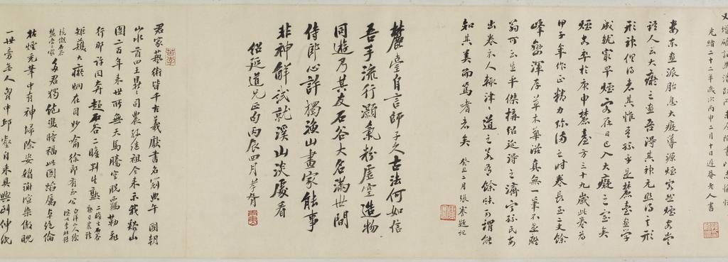 | Keywords: Wang Yuanqi -Wang Yuan-ch'i- - Free Spirits Among Streams and Mountains - Walters 35198 - View L.jpg When he painted this long handscroll in 1684 Wang Yuanqi Wang Yüan-ch'i the greatest orthodox master of the Qing Ch'ing dynasty had not yet developed the style for which he is best remembered Grounded in the lessons of his grandfather the artist Wang Shimin Wang Shih-min he aimed in his own way to make a work both as weighty and as free as that which was regarded as the greatest of Chinese handscrolls Huang Gongwang's Huang Kung-wang's Dwelling in the Fuchun Fu-ch'un Mountains of 1350 1684 ink paper H 13 x L 279 7/8 in 33 x 710 9 cm accession number 35 198 3491 James Freeman date and mode of acquisition unknown Walters Art Museum 1994 by purchase Museum purchase with funds provided by the W Alton Jones Foundation Acquisition Fund 1994 Free Spirits among Streams and Mountains A Chinese Handscroll by Wang Yuan-ch'i 1645-1715 The Walters Art Gallery Baltimore 1996 place of origin China Walters Art Museum license 2D Free Spirits Among Streams and Mountains Wang Yuanqi |