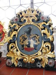 | Keywords: Wappen25.JPG Eines der vielen Wappen der Kirchenspender in der Dreieinigkeitskirche Buxach aus dem 18 Jahrhundert; Monogramm M H Jahreszahl 1754 Wappen auf rotem Schildfuss in Gold ein aufwachsender schwarzer Widder own 2008-06-14 User Memmingen Dreieinigkeitskirche Buxach Paintings of coats of arms Taken with Ricoh Caplio R6 1754 paintings Coats of arms in Memmingen Coats of arms of families of Germany - H Rams in heraldry Terraces in base gules Rams in crest | ||||