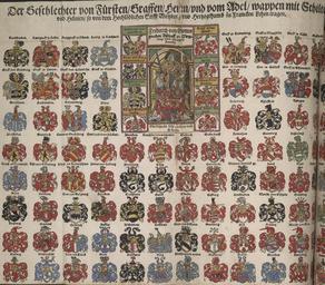 | Keywords: Wappentafel Stift Würzburg und Franken 1.jpg Der Geschlechter von Fursten Graffen Herrn vnd vom Adel Wappen mit Schilten vnd Helmen so von dem hochloblichen Stifft Wirtzburg vnd Hertzogthumb zu Francken Lehen Tragen Druck handkoloriert http //lcweb2 loc gov/cgi-bin/ampage collId rbc3 fileName rbc0001_2011rosen0709page db 1573 David Heyn printer <gallery> File Wappentafel Stift Würzburg und Franken 2 jpg second part of the scan File Wappentafel Stift Würzburg und Franken detail Bischof jpg detail Bishop Friedrich von Wirsberg File Wappentafel Stift Würzburg und Franken detail Bischof Wappen jpg detail coat of arms of bishop Friedrich von Wirsberg </gallery> PD-old-100 Armorials from Germany Coats of arms from Würzburg Coats of arms of families of Franconia 1573 engravings Friedrich von Wirsberg Coats of arms of Friedrich von Wirsberg Prince-Bishop of Würzburg Coats of arms of Germany to be classified Coats of arms of Stolberg family Coats of arms of Castell family Coats of arms of Grumbach family Coats of arms of Bibra family Coats of arms of Lichtenstein family Franconia Coats of arms of Schaumberg family Coats of arms of Rotenhan family Coats of arms of Truchseß von Baldersheim family Coats of arms of Schenken von Limpurg family Coats of arms of Eyb family Coats of arms of Hohenlohe family Coats of arms of Aufseß family Coats of arms of the Teutonic Order Coats of arms of Ysenburg-Büdingen family Coats of arms of Seinsheim family Coats of arms of Redwitz family Coats of arms of Gleichen family Coats of arms of Hanau-Münzenberg family Coats of arms of the House of Schwarzenberg Coats of arms of Heldritt family Coats of arms of Rechberg family ImageNote 1 1263 718 277 304 2666 2336 2 Coat of arms of Friedrich von Wirsberg Prince-Bishop of Würzburg ImageNoteEnd 1 ImageNote 2 1590 277 199 175 2666 2336 2 Coat of arms of Castell family ImageNoteEnd 2 ImageNote 3 1598 515 195 129 2666 2336 2 Coat of arms of Grumbach family ImageNoteEnd 3 ImageNote 4 269 1115 210 218 2666 2336 2 Coat of arms of Grumbach family ImageNoteEnd 4 ImageNote 5 756 866 218 222 2666 2336 2 Coat of arms of Bibra family ImageNoteEnd 5 ImageNote 6 1099 515 105 133 2666 2336 2 Coat of arms of Bibra family ImageNoteEnd 6 ImageNote 7 265 862 214 222 2666 2336 2 Coat of arms of Lichtenstein ImageNoteEnd 7 ImageNote 8 499 862 226 226 2666 2336 2 Coat of arms of Schaumberg family ImageNoteEnd 8 ImageNote 9 1598 706 199 172 2666 2336 2 Coat of arms of Stolberg family ImageNoteEnd 9 ImageNote 10 1879 1119 199 207 2666 2336 2 Coat of arms of Rotenhan family ImageNoteEnd 10 ImageNote 11 491 1361 226 218 2666 2336 2 Coat of arms of Truchseß von Baldersheim family ImageNoteEnd 11 ImageNote 12 1824 558 222 257 2666 2336 2 Coat of arms of Schenken von Limpurg family ImageNoteEnd 12 ImageNote 13 1879 1856 230 230 2666 2336 2 Coat of arms of Eyb family ImageNoteEnd 13 ImageNote 14 495 593 234 234 2666 2336 2 Coat of arms of Hohenlohe family ImageNoteEnd 14 ImageNote 15 737 1849 238 230 2666 2336 2 Coat of arms of Aufseß family ImageNoteEnd 15 ImageNote 16 19 324 230 234 2666 2336 2 Coat of arms of the Teutonic Order ImageNoteEnd 16 ImageNote 17 19 597 222 234 2666 2336 2 Coat of arms of Ysenburg-Büdingen family ImageNoteEnd 17 ImageNote 18 1002 718 199 168 2666 2336 2 Coat of arms of Ysenburg-Büdingen family ImageNoteEnd 18 ImageNote 19 27 866 203 222 2666 2336 2 Coat of arms of Seinsheim family ImageNoteEnd 19 ImageNote 20 2124 1860 222 222 2666 2336 2 Coat of arms of Redwitz family ImageNoteEnd 20 ImageNote 21 744 589 238 246 2666 2336 2 Coat of arms of Gleichen family ImageNoteEnd 21 ImageNote 22 242 585 257 250 2666 2336 2 Coat of arms of Hanau-Münzenberg family ImageNoteEnd 22 ImageNote 23 2319 581 246 230 2666 2336 2 Coat of arms of the House of Schwarzenberg ImageNoteEnd 23 ImageNote 24 2319 300 230 250 2666 2336 2 Coat of arms of Castell family ImageNoteEnd 24 ImageNote 25 503 1856 234 226 2666 2336 2 Coat of arms of Heldritt family ImageNoteEnd 25 |