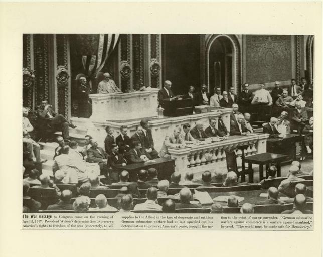 | Keywords: president wilson world war one worldwarone clark marshall germany congress monochrome Local Accession Number: 2073 Description: The war message to Congress came on the evening of April 2, 1917. President Wilson's determination to preserve America's rights to freedom of the seas (concretely, to sell supplies to the Allies) in the face of desperate and ruthless German submarine warfare had at last canceled out his determination to preserve America's neutrality. "German submarine warfare against commerce is a warfare against mankind," he cried. "The world must be made safe for democracy." Photographer: J.V. Buck Source: Unknown Size: 25x14 (mounted), 28x19 Medium: Print, Black and White Date: 04-02-1917 Local Accession Number: 2073 Description: The war message to Congress came on the evening of April 2, 1917. President Wilson's determination to preserve America's rights to freedom of the seas (concretely, to sell supplies to the Allies) in the face of desperate and ruthless German submarine warfare had at last canceled out his determination to preserve America's neutrality. "German submarine warfare against commerce is a warfare against mankind," he cried. "The world must be made safe for democracy." Photographer: J.V. Buck Source: Unknown Size: 25x14 (mounted), 28x19 Medium: Print, Black and White Date: 04-02-1917 |