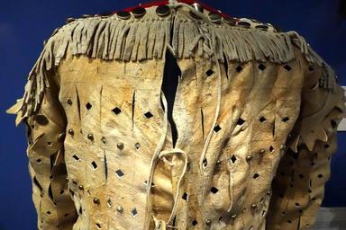 | Keywords: War shirt, Kainai, late 19th century, view 2, hide, weasel skins, brass buttons, red wool trim - Glenbow Museum - DSC00720.JPG en Exhibit in the Glenbow Museum 130 9th Ave S E Calgary Alberta Canada This work is old enough so that it is in the public domain Photography was permitted in the museum without restriction 2013-09-21 12 06 19 own Daderot cc-zero Armor in the Glenbow Museum Uploaded with UploadWizard Káínawa clothing | ||||
