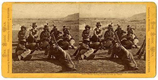 | Keywords: stereograph rifles rifle rifle stack riflestack photo border Repository: California Historical Society Collection: Stereographs of the Modoc War Photographer: Muybridge, Eadweard Date: 1873 General note: Stereographs published by Bradley & Rulofson. General note: Stereo No. 1628 Format: Stereograph Call Number: PC-RM-Stereos Digital object ID: PC-RM-Stereos_1628.jpg Preferred citation: Warm Spring Indian Scouts in Camp, Stereographs of the Modoc War, PC-RM-Stereos, courtesy, California Historical Society, PC-RM-Stereos_1628.jpg Repository: California Historical Society Collection: Stereographs of the Modoc War Photographer: Muybridge, Eadweard Date: 1873 General note: Stereographs published by Bradley & Rulofson. General note: Stereo No. 1628 Format: Stereograph Call Number: PC-RM-Stereos Digital object ID: PC-RM-Stereos_1628.jpg Preferred citation: Warm Spring Indian Scouts in Camp, Stereographs of the Modoc War, PC-RM-Stereos, courtesy, California Historical Society, PC-RM-Stereos_1628.jpg |