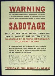 | Keywords: "WARNING...SABOTAGE. THE FOLLOWING ACTS, AMONG OTHERS, ARE CRIMES AGAINST THE UNITED STATES...TREASON IS PUNISHABLE... - NARA - 516041.jpg Scope and content General notes 516041 Local identifier 44-PA-2315 Office for Emergency Management Office of War Information Domestic Operations Branch Bureau of Special Services 03/09/1943 - 09/15/1945 Still Picture Records Section Special Media Archives Services Division NWCS-S National Archives at College Park 8601 Adelphi Road College Park MD 20740-6001 1941 - 1945 Record group Record Group 44 Records of the Office of Government Reports 1932 - 1947 Record group ARC 373 World War II Posters compiled 1942 - 1945 Series ARC 513498 File unit File unit ARC Variant control numbers NAIL Control Number NWDNS-44-PA-2315 Other versions <gallery> File WARNING SABOTAGE _THE_FOLLOWING_ACTS _AMONG_OTHERS _ARE_CRIMES_AGAINST_THE_UNITED_STATES TREASON_IS_PUNISHABLE _-_NARA_-_516041 tif tif File WARNING SABOTAGE _THE_FOLLOWING_ACTS _AMONG_OTHERS _ARE_CRIMES_AGAINST_THE_UNITED_STATES TREASON_IS_PUNISHABLE _-_NARA_-_516041 jpg jpg </gallery> NARA-cooperation PD-USGov World War II posters from the United States Sabotage |