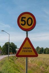 Keywords: warning sign gropafesten 50-plate road field countryside forest