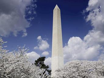 Keywords: washington monument cherry trees blooming blossoms springtime spring clouds memorial historical tourists landmark symbol washington dc tourism usa