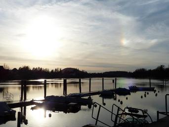Keywords: water boats buoys shipping river stein am rhein rhine sun sundog parhelia haloerscheinung weather phenomenon clouds iridescent cloud cirrus non iridescent