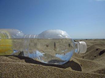 Keywords: water bottle sand horizon beach heat sky sun thirst water horizontal water level
