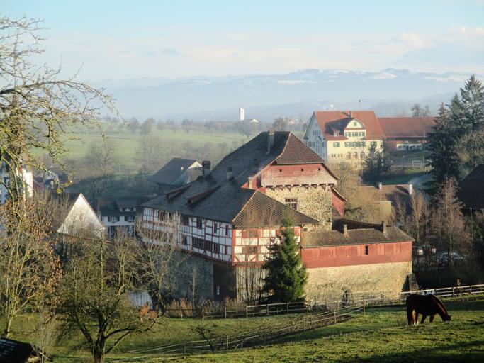 Keywords: water castle hagenwil thurgau switzerland foresight mountains viewpoint distant view trees horses water
