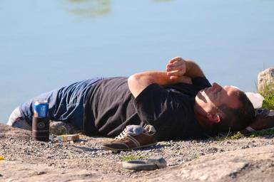 Keywords: water ground man beer can cigarette box shoes socks lying on the ground rest sun