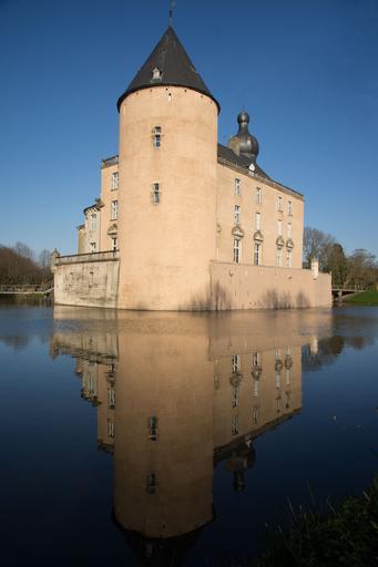 Keywords: water lake castle tower mirroring gemen borken westfalen blue mirror image reflections middle ages knights castle wall wide