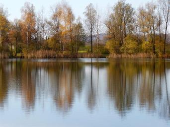 Keywords: water lake perach badesee peracher bathing lake altötting autumn mood mirroring nature landscape trees bushes naturseeags comma separated