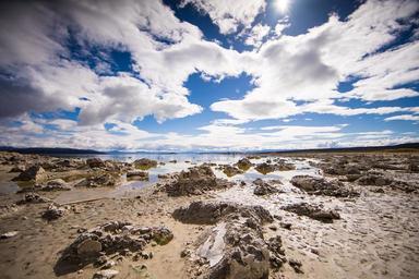 Keywords: water lake shore coast beach sand rocks wet reflection clouds horizon nature landscape sky scene weather sea ocean peaceful low tide ebb muddy