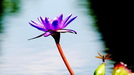 Keywords: water lily lotus blossom aquatic floral pond dragonfly purple nature bloom garden petals