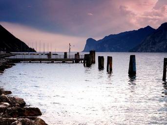 Keywords: water port bank web mountains landscape nature sky abendstimmung sea jetty boardwalk pier ship garda