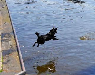 Keywords: water port dog jump get ball belly flop action pier
