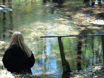Keywords: water river fluent rest woman blond silent thoughts thinking flow autumn clear water waters surface illuminated transparent bank kneip frisch clear ruhr sauerland melankolie