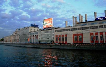 Keywords: water river reflection buildings white red trimmings smoke stacks factory industrial embankment sky