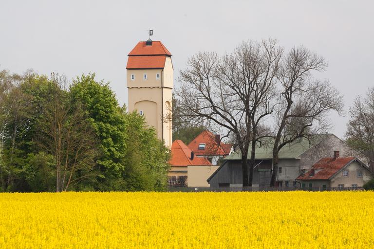 Keywords: water tower oilseed rape field of rapeseeds tree nature spring may field landscape yellow homestead hof agriculture operation recovery rest