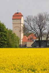 Keywords: water tower oilseed rape field of rapeseeds tree nature spring may field landscape yellow homestead hof agriculture operation