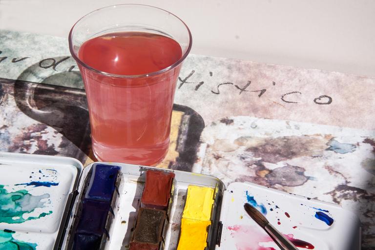 Keywords: watercolor box color color wells malkasten color blends colorful mix brush wet paint watercolour paper graphic water glass