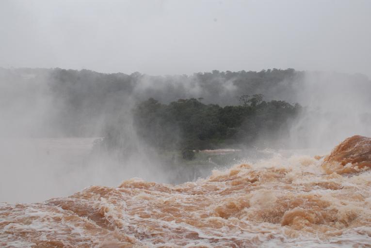 Keywords: waterfall churning tumultuous mist rough water dangerous brown nature flowing argentina iguazu