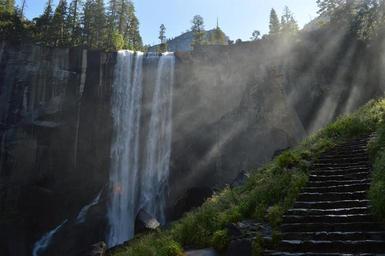 Keywords: waterfall cliff sunbeams stairs steps mountains nature wild water stream river fall cascade spray motion flow high rock scenic view outdoors wilderness