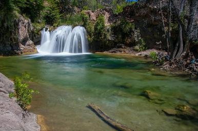 | Keywords: arizona camp verde campverde coconino national forest coconinonationalforest forest service forestservice fossil creek fossilcreek k20d national forest nationalforest pentax k20d pentaxk20d red rock ranger district redrockrangerdistrict tonto national forest tontonationalforest usfs verde valley verdevalley waterfall trail waterfalltrail canyon creek desert forest hiking ndfilter outdoors riparian spring springtime trail water waterfall united states unitedstates outdoor landscape watercourse This large, natural waterfall on Fossil Creek is the destination of an easy, one mile hike on Waterfall Trail. A large, deep pool at the base of the fall is a popular swimming hole. Fossil Creek produces 20,000 gallons of water a minute from a series of springs at the bottom of a 1,600 foot deep canyon. This permanent water source has created a stunningly beautiful, green riparian zone rich with flora and fauna at the bottom of this arid canyon in Arizona's high desert. Travertine deposits encase whatever happens to fall into the streambed, forming the fossils for which the area is named. These deposits create deep pools along the length of the creek, providing opportunities to find more secluded swimming holes than the popular pool at the waterfall. Fossil Creek is one of two "Wild and Scenic" rivers in Arizona. This designation was achieved when the Irving power plant was decommissioned, and removal of flume and dam on the creek allowed the creek to flow free. Increasing popularity has led to the Coconino and Tonto National Forests to implement a parking permit reservation system in 2016. Reserved parking permits allow visitors to have a parking spot available in their chosen parking lot. Many visitors drive two or three hours to get to the creek. The final descent to the creek at the bottom of a canyon is on an extremely rough, rocky jeep road. In prior years, the area would often be closed to entry when it reached capacity, and potential visitors would be turned away after the long, difficult drive. Photo by Deborah Lee Soltesz, May 12, 2016. For trail and recreation information, see Fossil Creek, Fossil Springs Wilderness, and the Coconino National Forest. This large, natural waterfall on Fossil Creek is the destination of an easy, one mile hike on Waterfall Trail. A large, deep pool at the base of the fall is a popular swimming hole. Fossil Creek produces 20,000 gallons of water a minute from a series of springs at the bottom of a 1,600 foot deep canyon. This permanent water source has created a stunningly beautiful, green riparian zone rich with flora and fauna at the bottom of this arid canyon in Arizona's high desert. Travertine deposits encase whatever happens to fall into the streambed, forming the fossils for which the area is named. These deposits create deep pools along the length of the creek, providing opportunities to find more secluded swimming holes than the popular pool at the waterfall. Fossil Creek is one of two "Wild and Scenic" rivers in Arizona. This designation was achieved when the Irving power plant was decommissioned, and removal of flume and dam on the creek allowed the creek to flow free. Increasing popularity has led to the Coconino and Tonto National Forests to implement a parking permit reservation system in 2016. Reserved parking permits allow visitors to have a parking spot available in their chosen parking lot. Many visitors drive two or three hours to get to the creek. The final descent to the creek at the bottom of a canyon is on an extremely rough, rocky jeep road. In prior years, the area would often be closed to entry when it reached capacity, and potential visitors would be turned away after the long, difficult drive. Photo by Deborah Lee Soltesz, May 12, 2016. For trail and recreation information, see Fossil Creek, Fossil Springs Wilderness, and the Coconino National Forest. |