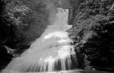 Keywords: waterfall water cascade downfall chute current streaming flowing dynamics liquid black and white