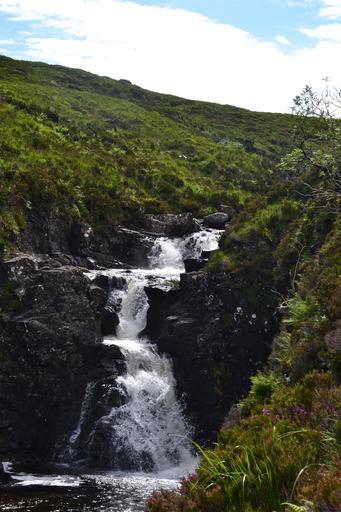 Keywords: waterfall water nature scotland landscape murmur green meadow sky blue