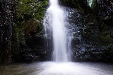 Keywords: waterfall water silky smooth hiking tramping trekking nature cliff plants moss slippery wet contrast jungle forest tropical white green dark pool refreshing cool river rock woods