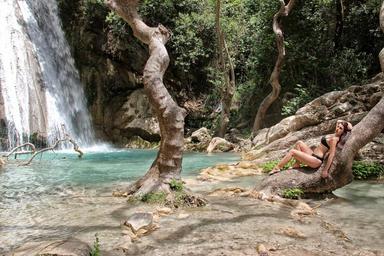 Keywords: waterfalls young woman bikini model tree posing neda peloponissos greece