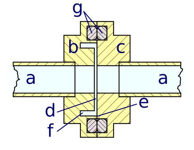 Keywords: Waveguide-choke-flange-cross-section.svg handSVG ValidSVG en E-plane cross-section of connected choke and gasket/cover waveguide flanges These are the flanges in the photo File Waveguide-choke-flange-UG-1666-U jpg In the cross-section the gap between the flange faces has been exaggerated by a factor of 4 to make it clearly visible Legend a waveguide tubing socket-mounted into b choke flange and c gasket/cover flange d gap between flange faces width exaggerated by factor of 4 e point of contact of flange faces f short at bottom of choke ditch g O-ring gaskets to allow pressurization own Catslash Waveguide flanges SVG electricity |