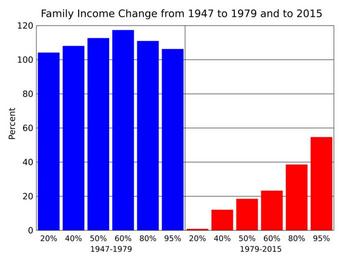 | Keywords: We grew together but now we grow apart.svg translate yes en From 1947 to 1979 incomes in the United States doubled for all income groups from the bottom 20 to the top 5 but since 1979 income have stagnated for the bottom 20 and only grown slowly for the top 5 Off the chart though is the growth in income of the top 1 which tripled since 1979 growing by 224 Data from US Census https //www census gov/data/tables/time-series/demo/income-poverty/cps-finc/finc-01 html 2016-09-17 own Delphi234 other versions cc-zero Income distribution in the United States |