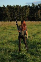 Keywords: weapon fight shoot keep woman girl rear view hair long red lion's mane warrior end apocalypse breitbeinig whole body forest floor meadow hip supported see army modern times metal gloss evening sun soft light new life size