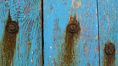 Keywords: weathered paint wood screw rust plank blue old tatty neglect neglected flake flaking weathering decay iron run-down corrosion corrode transience cracks material durability time weather