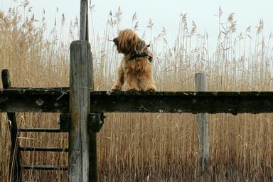 Keywords: web boardwalk reed animal dog alone wait stand view look back back head stairs wooden ladder jetty