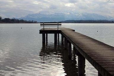 Keywords: web boardwalk water lake chiemsee distant view wide outlook vision foresight bench rest break recover relax sit recovery bank seat rest pause