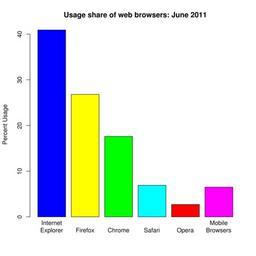 | Keywords: Web browser usage share.svg Summary A bar chart of the usage share of web browsers using data from the median values of the summary table of en Usage share of web browsers Created with R v title Usage share of web browsers June 2011 percent c 40 9 26 8 17 6 6 9 2 7 6 5 name c Internet\nExplorer Firefox Chrome Safari Opera Mobile\nBrowsers color c 0000FFFF FFFF00FF 00FF00FF 00FFFFFF FF0000FF FF00FFFF svg barplot height percent names arg name col color main title ylab Percent Usage dev off original upload log page en wikipedia Web_browser_usage_share svg '1' Upload date User Bytes Dimensions Comment - nowrap 2009-11-27 09 55 31 nowrap Jdm64 nowrap 42925 nowrap 630×630 <small><nowiki>Median is what we want since 1 number of sources is small 2 it's unknown how the sources calculate the percentages Mean is just wrong Also changed other to be the median of the missing from the sources </nowiki></small> - nowrap 2009-11-26 21 25 07 nowrap Thorenn nowrap 69092 nowrap 417×415 <small><nowiki>Changed to match mean as opposed to median values I used a different method to make it svg as I am unfamiliar with R I request the original author to reflect the value changes based on my reasons stated here User talk Wikiolap Template Browser marke</nowiki></small> - nowrap 2009-11-26 20 22 45 nowrap Thorenn nowrap 43926 nowrap 630×630 <small><nowiki>Reverted to version as of 17 45 30 October 2009</nowiki></small> - nowrap 2009-11-26 20 19 01 nowrap Thorenn nowrap 6843 nowrap 555×554 <small><nowiki>Changed to match mean as opposed to median values Unfortunately could not make it svg I request the original author to reflect the value changes based on my reasons stated here User talk Wikiolap Template Browser marketshare </nowiki></small> - nowrap 2009-11-18 18 51 40 nowrap Jdm64 nowrap 42912 nowrap 630×630 <small><nowiki>oct update</nowiki></small> - nowrap 2009-10-30 17 45 58 nowrap Killiondude nowrap 43926 nowrap 630×630 <small><nowiki>Reverted to version as of 12 39 18 October 2009</nowiki></small> - nowrap 2009-10-29 10 36 25 nowrap Manfroze nowrap 71204 nowrap 630×630 <small><nowiki>fixed</nowiki></small> - nowrap 2009-10-29 10 34 16 nowrap Manfroze nowrap 2615 nowrap 630×630 <small><nowiki>better graphics</nowiki></small> - nowrap 2009-10-18 12 39 54 nowrap Gnassar nowrap 43926 nowrap 630×630 <small><nowiki>Reverted to version as of 00 53 4 October 2009 - wrong image format</nowiki></small> - nowrap 2009-10-18 12 38 41 nowrap Gnassar nowrap 9674 nowrap 650×649 <small><nowiki>September with numbers from corrected article</nowiki></small> - nowrap 2009-10-04 00 53 05 nowrap Clorox nowrap 43926 nowrap 630×630 <small><nowiki>Reverted to version as of 03 37 3 October 2009 Text boxes appeared as black rectangles oops </nowiki></small> - nowrap 2009-10-04 00 52 27 nowrap Clorox nowrap 48079 nowrap 630×630 <small><nowiki>Easier to view</nowiki></small> - nowrap 2009-10-03 03 37 52 nowrap Jdm64 nowrap 43926 nowrap 630×630 <small><nowiki>September Update</nowiki></small> - nowrap 2009-09-08 02 46 33 nowrap Jdm64 nowrap 42182 nowrap 630×630 <small><nowiki>August update; use median of sources</nowiki></small> - nowrap 2009-08-01 19 06 43 nowrap Jdm64 nowrap 42385 nowrap 630×630 <small><nowiki>July update</nowiki></small> - nowrap 2009-06-03 21 28 33 nowrap Jdm64 nowrap 41510 nowrap 630×630 <small><nowiki>May update</nowiki></small> - nowrap 2009-05-03 19 53 42 nowrap Jdm64 nowrap 42231 nowrap 630×630 <small><nowiki>April update</nowiki></small> - nowrap 2009-04-02 16 15 44 nowrap Jdm64 nowrap 41969 nowrap 630×630 <small><nowiki>March Update</nowiki></small> - nowrap 2009-03-03 05 45 18 nowrap Jdm64 nowrap 42514 nowrap 630×630 <small><nowiki>February update</nowiki></small> - nowrap 2009-02-01 23 09 25 nowrap Jdm64 nowrap 43133 nowrap 630×630 <small><nowiki>Summary A pie chart of the usage share of web browsers using data from http //marketshare hitslink com/browser-market-share aspx qprid 0 Net Applications It was created using R with the following R code <pre> browse</nowiki></small> derivative works Web browser usage share fr svg Web browser statistics SVG bar charts Images with R source code |