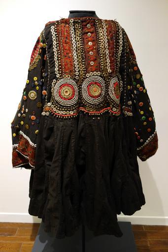 Keywords: Wedding dress (jumlo), Indus Kohistan, Northwest Frontier Province, Pakistan, view 1, mid 20th century, cotton, metal and glass beads, plastic buttons - Textile Museum of Canada - DSC00936.JPG en Exhibit in the Textile Museum of Canada 55 Centre Avenue Toronto Ontario Canada Photography was permitted in the museum without restriction 2013-07-04 14 15 44 own Daderot cc-zero Textiles in the Textile Museum of Canada Uploaded with UploadWizard |